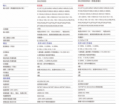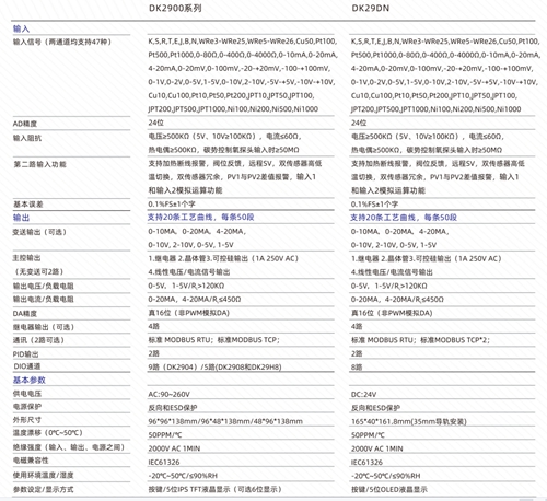 DK2900系列程序过程控制仪表是采用测量控制技术设计的工业过程控制仪表。具有双通讯功能。支持以太网。有测量和控制精度高等特点。支持47种工业信号输入。双路加热制冷控制,支持阀位反馈等。